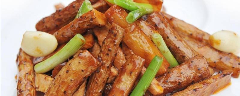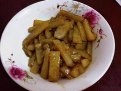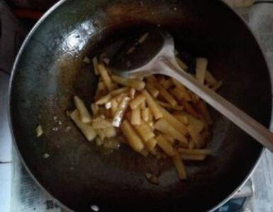 4.热锅冷油,倒入淮山,翻炒一会儿,加盐拌匀,加入蚝油、生抽继续翻炒。快要出锅时可加入少量酱油上色,倒入少许清水,大火收汁即可出锅。