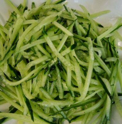 1、拉皮,过凉水,加少许香油,拌均匀,黄瓜切丝。