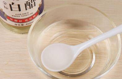 1、先准备80°左右的温水,将食用碱和白醋按1:1的比列溶解。