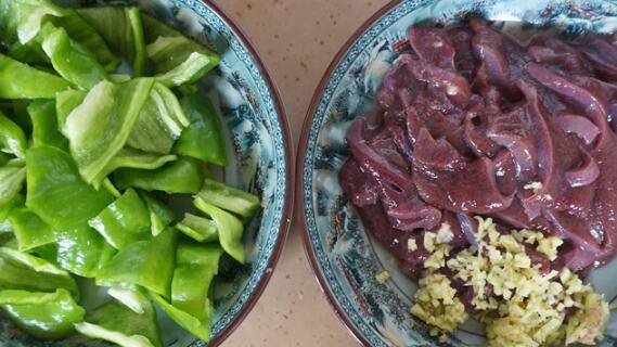 青椒和猪肝清洗干净,猪肝切片备用,青椒去籽切片、生姜切末备用。