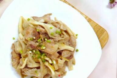 锅中放油加肉片,姜蒜,炒至变色加平菇。
