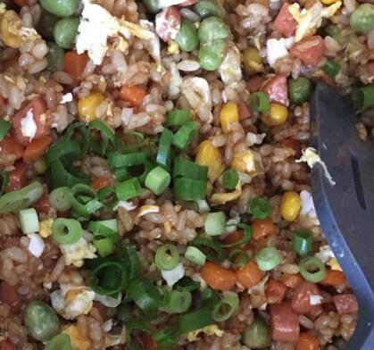 鸡蛋2个、玉米30g、胡萝卜150g、青豆20g、盐1g、生抽15g、老抽少许、油20g、白米饭1碗、蚝油1勺。