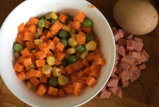 胡萝卜洗净切丁,火腿肠切丁备用。