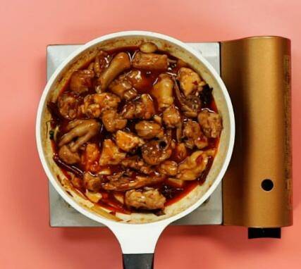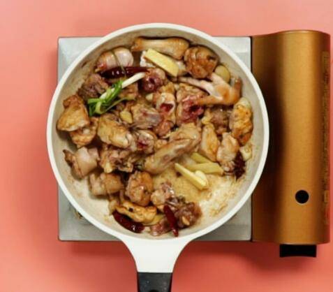将鸡肉放入糖浆中,再加入辣椒、葱、花椒、八角、蒜,翻炒均匀后加入郫县豆瓣酱、生抽、盐继续翻炒。