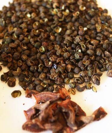 干红辣椒切段,花椒一把,八角掰成瓣。