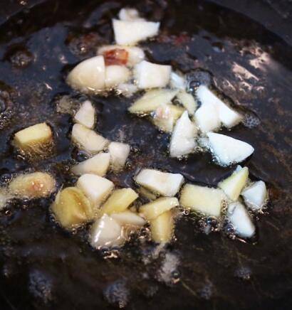 锅里留下底油,加姜蒜爆香。加辣椒、花椒、八角。