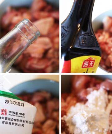 鸡大腿切丁,加入料酒、味极鲜酱油、盐、淀粉拌匀,腌制30分钟。