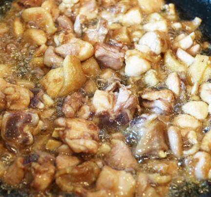 锅里热油,油热之后下鸡丁翻炸,炸之焦黄色即可。