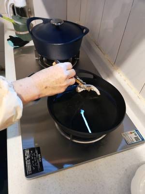 4、热锅冷油,转小火,油8成热下鱼。