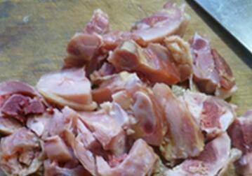 2、烧锅倒油烧热,下入剁好的腊鸡腿翻炒均匀。