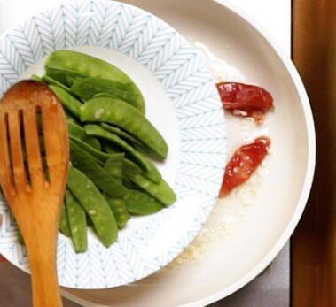 3、倒入腊肠、荷兰豆、清水,翻炒均匀。