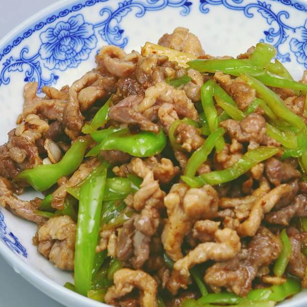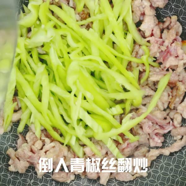 6、肉丝炒半熟后,倒入青椒翻炒。