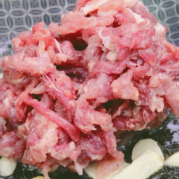 4、锅中放入食用油,加入大蒜爆香,倒入肉丝。