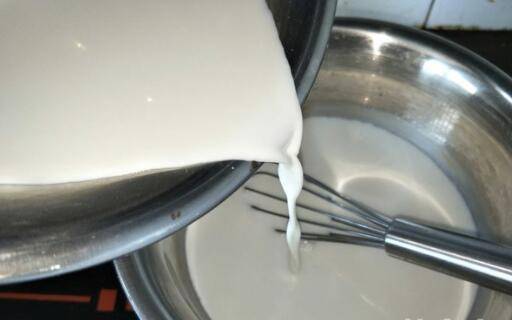 缓缓的,倒入之前搅拌好的牛奶玉米淀粉。一边倒一边搅拌,不要停。