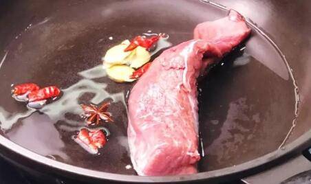 里脊肉洗干净后放入锅中,倒入姜片和八角、5克干辣椒,煮至里脊肉变色8分熟。