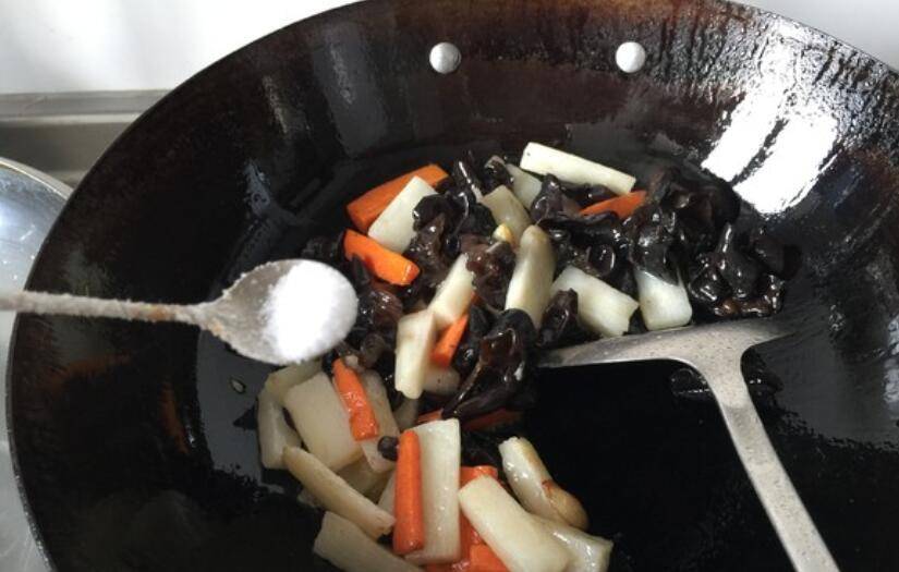 主料:黑木耳100克、胡萝卜半个、山药200克、盐1小勺、鸡精少许、蒜瓣3个、葱2棵。