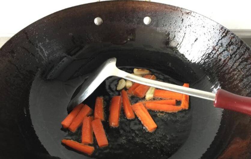 2、山药和胡萝卜切长条状,山药最好浸泡清水里就不会发黑,我马上要炒了就没有浸泡。