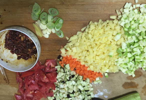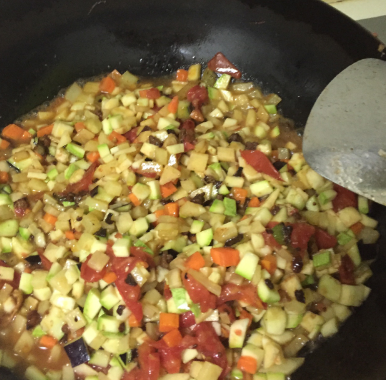 加入西红柿翻炒至西红柿出沙,入其它所有蔬菜翻炒。