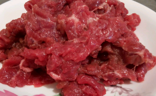 3、用的是菜籽油(菜籽油要等到冒烟以后,再放牛肉片),倒入牛肉片快速滑炒,滑炒至牛肉片变色,盛盘。