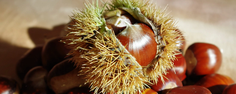 板栗的外形呈总苞球形,外面生尖锐被毛的刺,锐刺有长有短,有疏有密,密时全遮蔽壳斗外壁,疏时则外壁可见,内藏坚果2-3个,成熟时外壳裂为4瓣,栗果脱落。坚果紫褐色,被黄褐色茸毛,或近光滑,果肉淡黄。