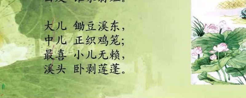 译文:草屋的茅檐又低又小,溪边长满了碧绿的小草。含有醉意的吴地方言,听起来温柔又美好,那满头白发的老人是谁家的呀?大儿子在溪东边的豆田锄草,二儿子正忙于编织鸡笼。最令人喜爱的是小儿子,他正趴在溪头草丛,剥着刚摘下的莲蓬。