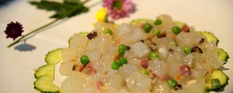 4、细露蹄筋:细露蹄筋是宴席中一道必备的中高档炒菜。蹄筋有鲜、干两种,鲜蹄筋用清水浸泡即可使用,干蹄筋需经过水发、油发、盐发三种方法泡发才能使用。细露蹄筋以水发蹄筋为佳。先将鸡脯丁、火腿丁、香茹丁、熟笋丁、青豆丁等辅料在炒锅中用熟猪油炒一下,然后加绍酒、精盐、高汤及蹄筋再炒,烧沸后移小火烧,最后转旺火勾芡,淋麻油起锅装盘即可。