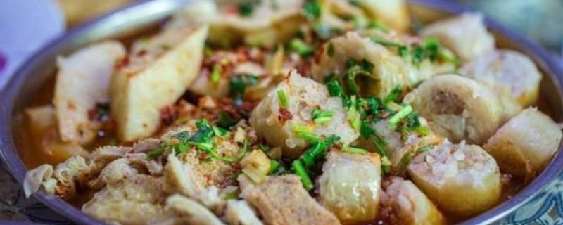 5、面肺子:把白面洗出面筋,待面水澄清过后,留少量的水搅成面浆,然后把面浆放入羊肺中,放入调料缝上,煮熟切片即可。