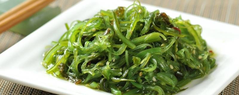 4、裙带菜泡开后,用刀切成小块,然后用开水清洗一下。