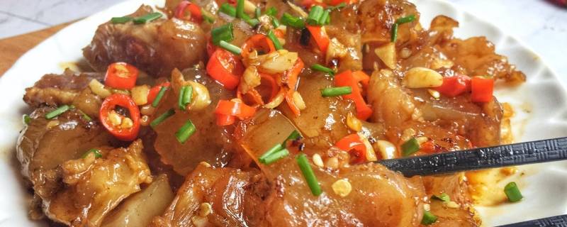 1、准备食材:蹄筋、生姜、大葱、八角、花椒、盐、清水、腐竹、鲜香菇、蒜、干辣椒、生抽、老抽、糖。