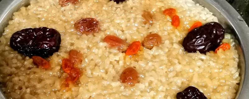 5、在刚才装饰好的蜜枣和青红丝上铺一层蒸熟的糯米,并将炒制报团的豆沙馅填入,最后再在上层盖一层糯米。