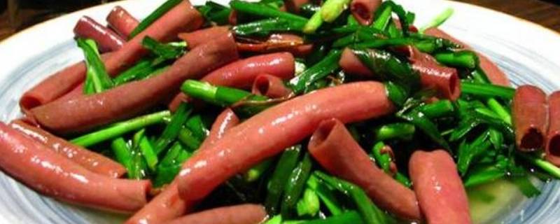 4、姜炝锅,倒入海肠和韭菜加料酒和碗汁翻炒几下即可出锅。