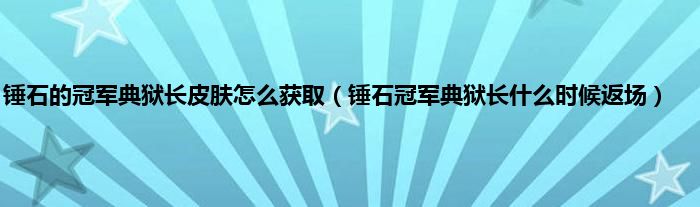 大家好,小常来为大家解答以上问题。锤石的冠军典狱长皮肤怎么获取,锤石冠军典狱长什么时候返场很多人还不知道,现在让我们一起来看看吧!