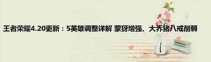 王者荣耀正式服4月20日今天更新了,今天更新了不少内容,除了西施的新皮肤之外,还有不少新的活动和新的改动。英雄调整方面,对蒙犽、大乔、猪八戒、狂铁、钟无艳五名英雄做出调整。困扰高端局玩家许久的大乔问题以及峡谷横行的“双烧流猪八戒”兴许都将跌落神坛。