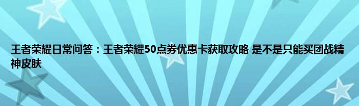 今天来聊聊关于王者荣耀日常问答:王者荣耀50点券优惠卡获取攻略,是不是只能买团战精神皮肤的文章,游戏是很多人的选择,但是游戏玩多了也会身心疲惫,现在就为大家来简单介绍下王者荣耀日常问答:王者荣耀50点券优惠卡获取攻略,是不是只能买团战精神皮肤,希望对各位小伙伴们有所帮助。