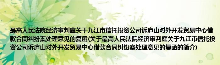 大家好,最高人民法院经济审判庭关于九江市信托投资公司诉庐山对外开发贸易中心借款合同纠纷案处理意见的复函,关于最高人民法院经济审判庭关于九江市信托投资公司诉庐山对外开发贸易中心借款合同纠纷案处理意见的复函的简介很多人还不知道,现在让我们一起来看看吧!