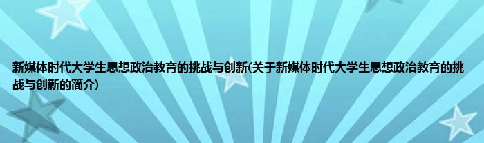 大家好,新媒体时代大学生思想政治教育的挑战与创新,关于新媒体时代大学生思想政治教育的挑战与创新的简介很多人还不知道,现在让我们一起来看看吧!